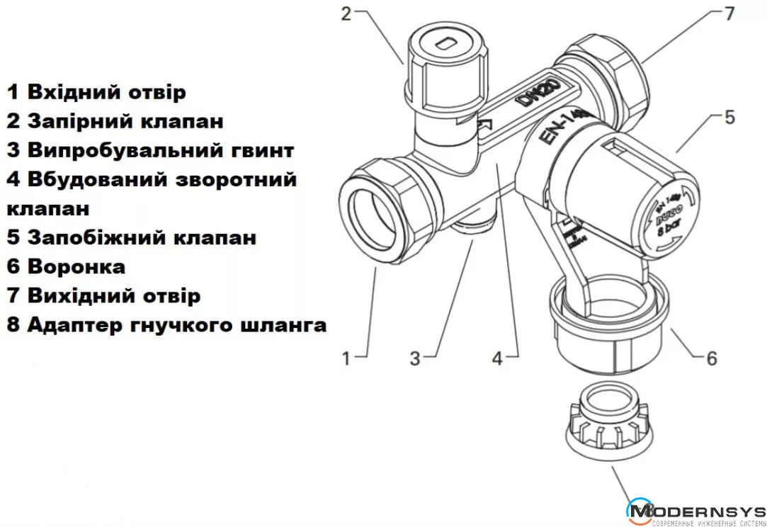 Запірний клапан, вбудований зворотний клапан, запобіжний клапан (6 бар) та поворотна лійка на 360º.