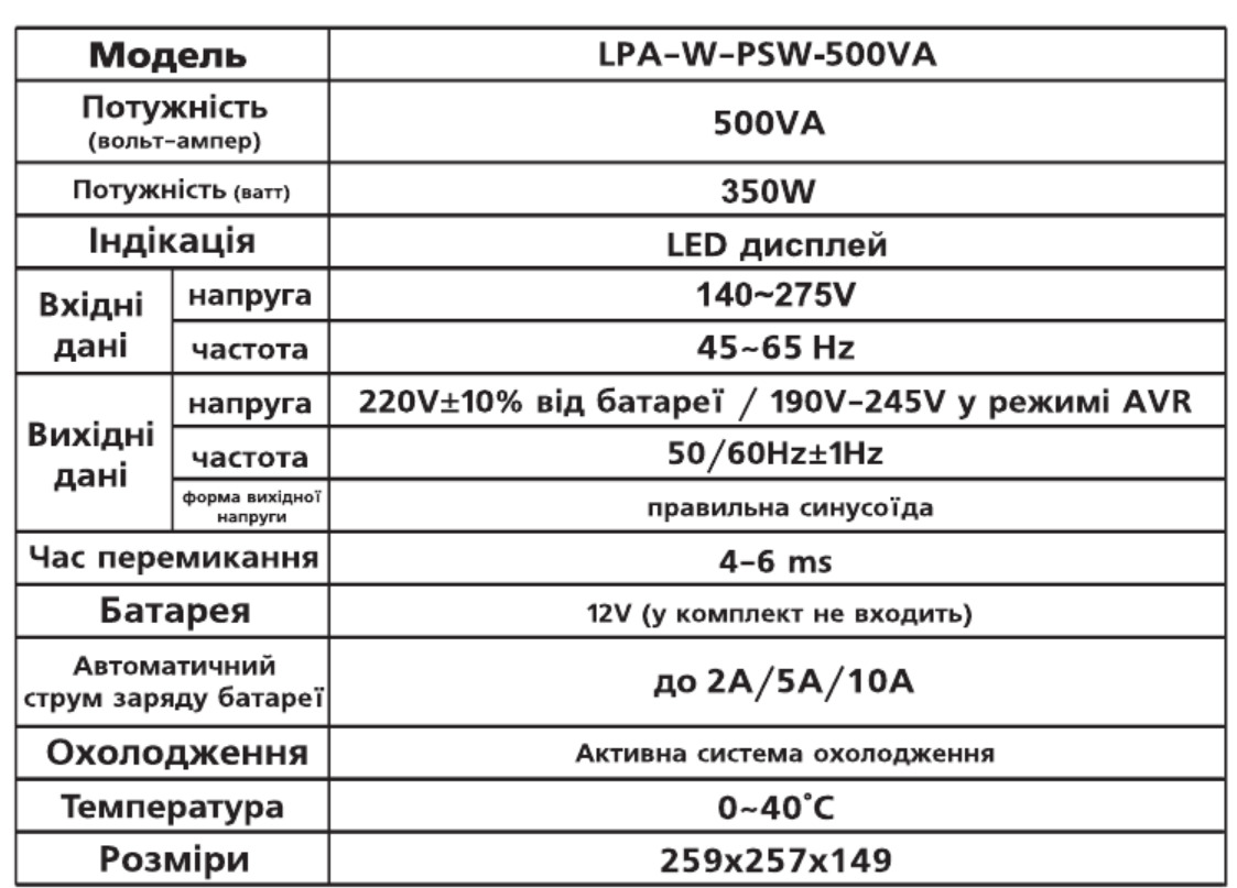 ДБЖ з правильною синусоїдою LPA-W-PSW-500VA (350Вт) 2A/5A/10A має потужність 500/350 Вт.