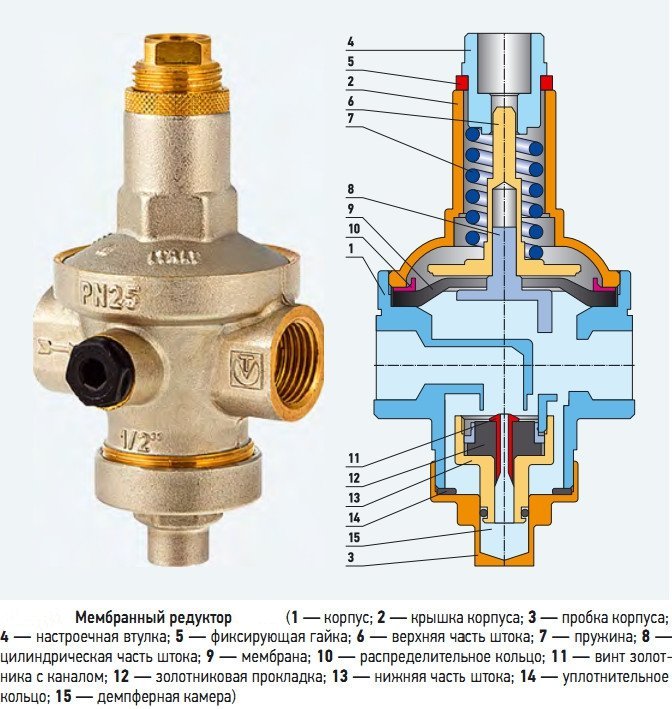 Мембранні редуктори зниження тиску рідини – це найбільш надійні обмежувачі з усіх існуючих. Все завдяки тому, що в них немає рухомих деталей, що приводяться в рухи зовні, а всі функціональні частини повністю герметизовані. На відміну від поршневих аналогів, у конструкції мембранного редуктора є пружина, що підтримує не поршень, а невелику еластичну мембрану. При цьому пружина знаходиться в сухій камері, а рідина подається до спеціального відсіку. У процесі функціонування мембрана передає вплив пружини клапан, завдяки чому змінюється розмір умовного проходу. При цьому, за рахунок еластичності мембрани, камера пристрою без проблем пропускає дрібні забруднення, що не впливають на роботу такого виробу. Що стосується регулювання мембранного редуктора тиску води, то воно виконується спеціальним гвинтом.