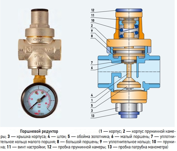 Конструктивно стандартний регулятор тиску води поршневого типу складається з таких основних елементів: