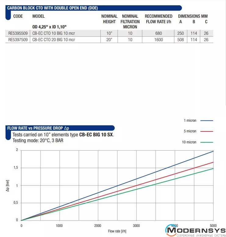 Технічні характеристики: Картридж Atlas Filtri (Атлас Фильтры) (спечена вугільна пудра) CB-EC BIG CTO (прибирає запахи) 10" SX 10 mcr 45°C