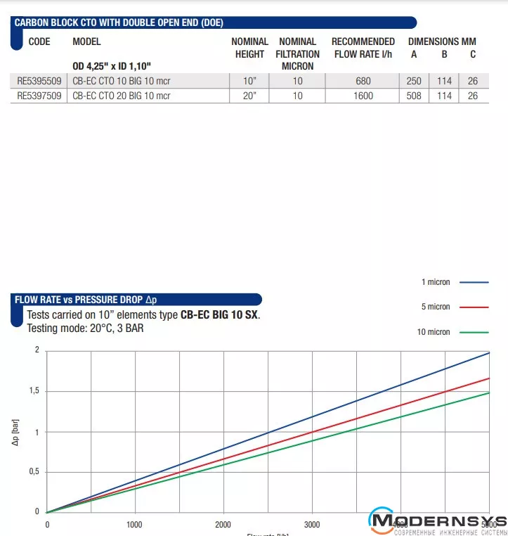 Технічні характеристики: Картридж Atlas Filtri (Атлас Фильтры) (спечена вугільна пудра) CB-EC BIG CTO (прибирає запахи) 20" SX 10 mcr 45°C
