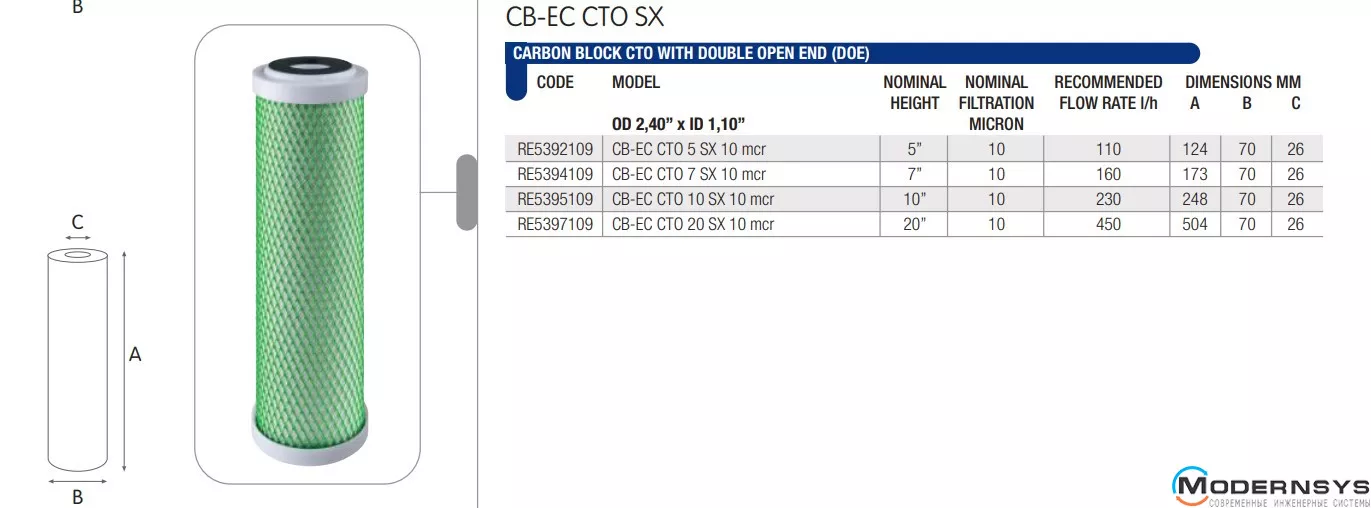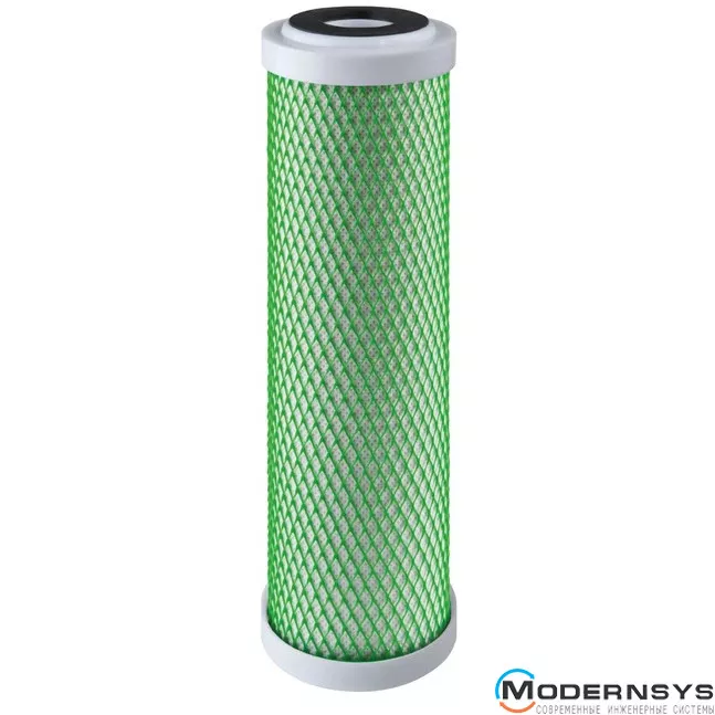 Картридж "карбон-блок" з активованим спресованим вугіллям рослинного "екологічного" походження. Дозволяє очистити воду від дрібних домішок, знижує смак та запах хлору ( CTO ).