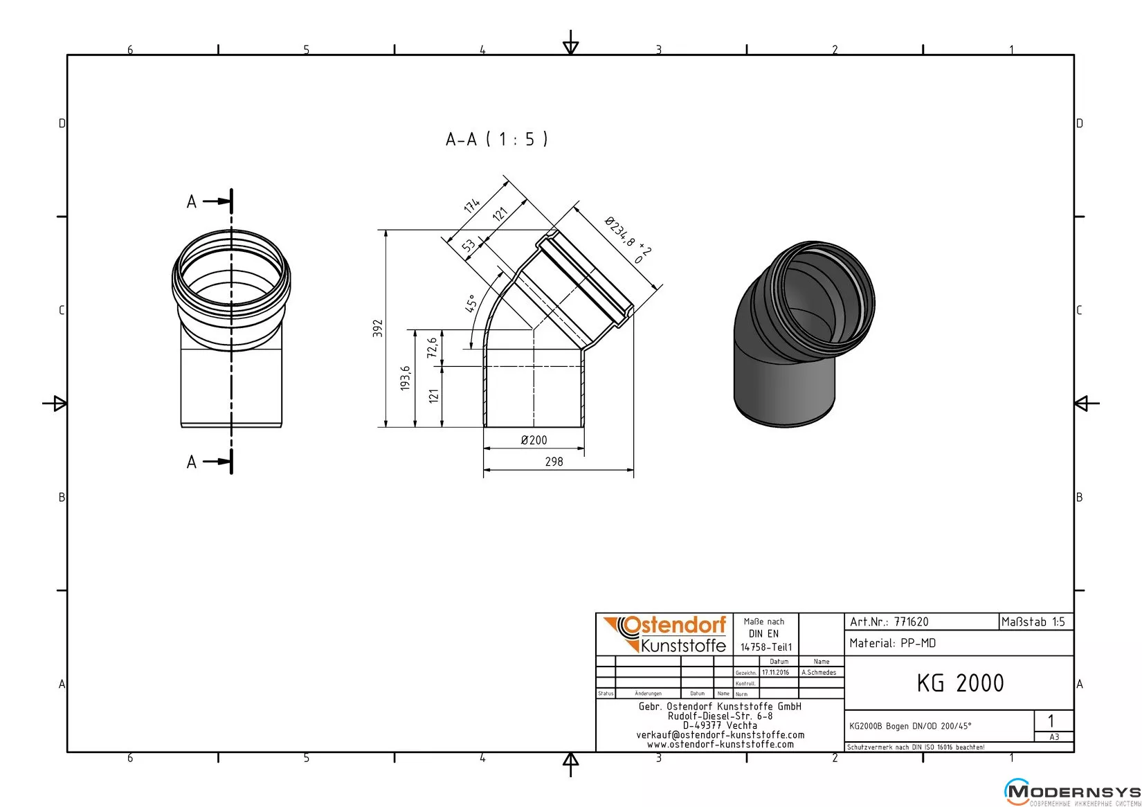 Технічні характеристики: Коліно каналізаційне Ostendorf (Остендорф) KG2000B 200х45°