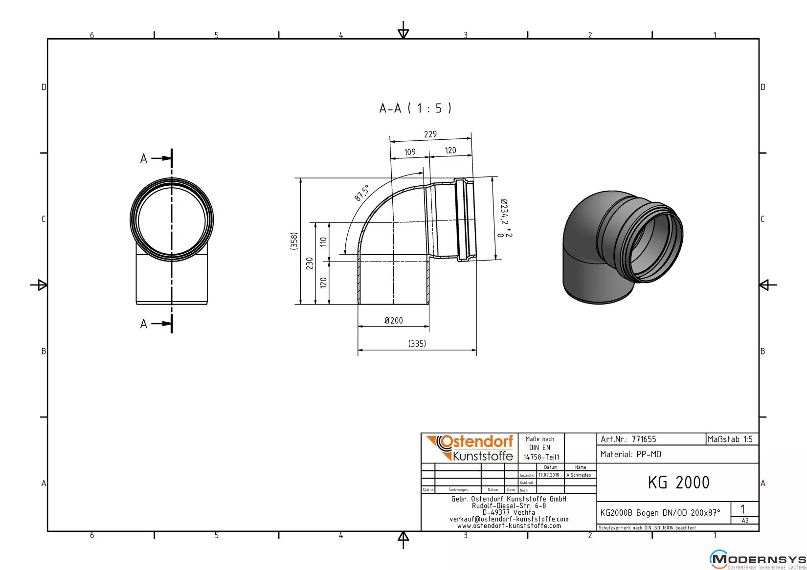 Технічні характеристики: Коліно каналізаційне Ostendorf (Остендорф) KG2000B 200х87 °