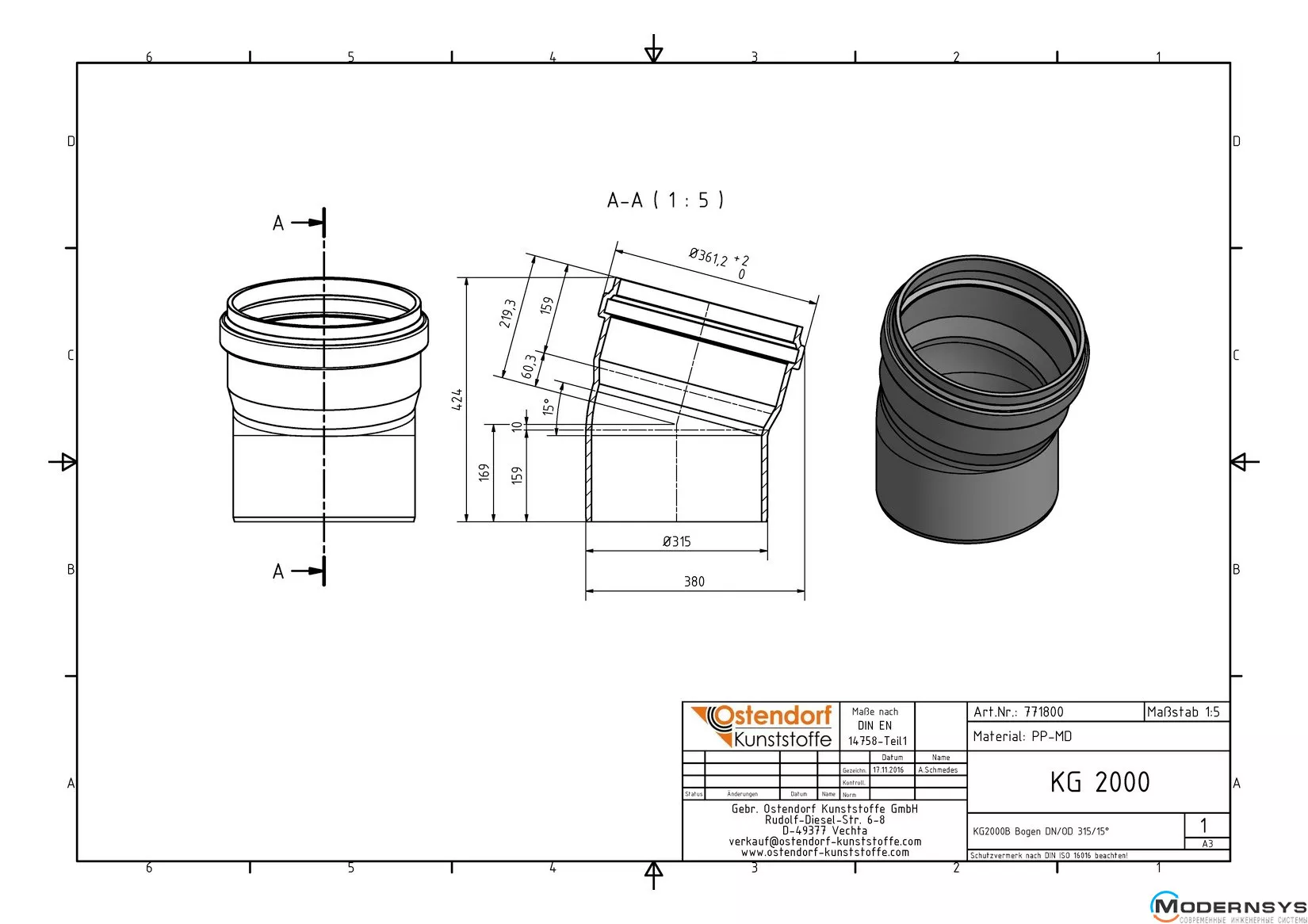 Опис: Коліно каналізаційне Ostendorf (Остендорф) KG2000B 315х15°
