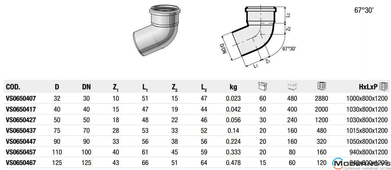 Технічні характеристики: Коліно Valsir (Валсир) Triplus Ø32 67°