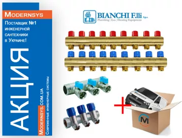 Технічні характеристики: Колектор Bianchi (Биянчи) з кульовими кранами 1" х 4 х 3/4" ЗР (синій) I=45 мм (204C06050D)