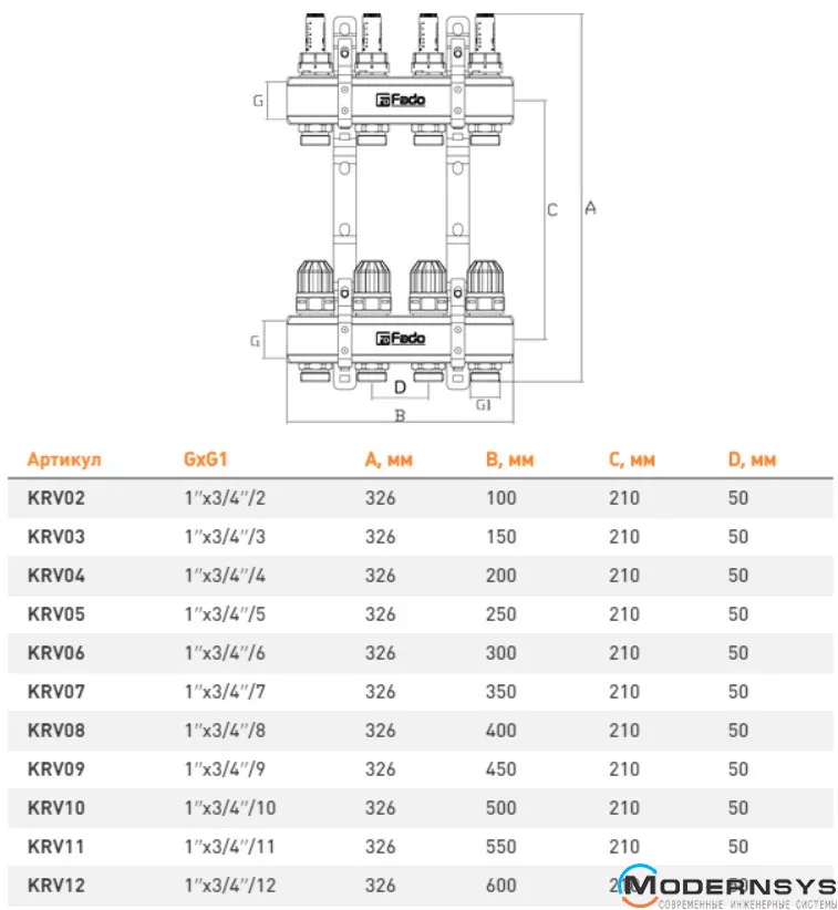 Комплектація гребінки для опалення FADO KRV KRVS: