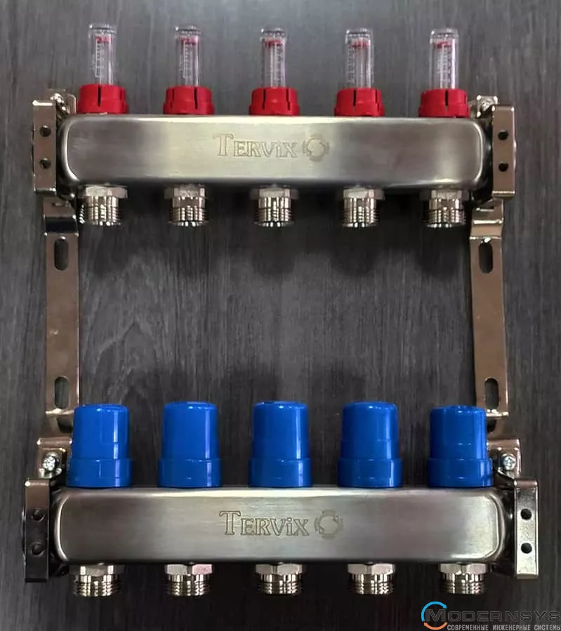 Розподільні гребінки Tervix призначені для використання в системах «Тепла підлога». За допомогою витратомірів легко встановити розрахункову витрату теплоносія через контур теплої підлоги.