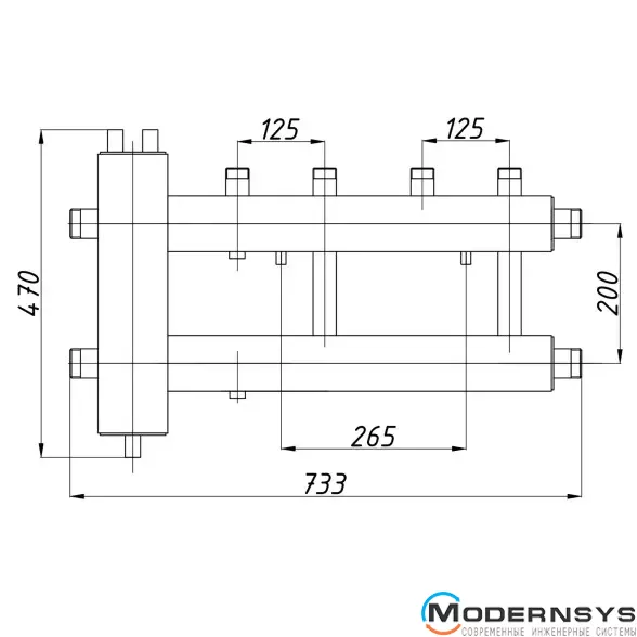 Міжосьова відстань патрубків підключення контуру споживача тепла дорівнює 125 мм.