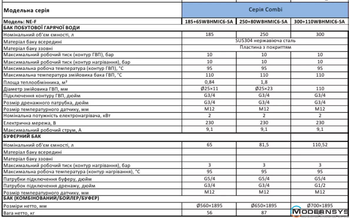 Технічні характеристики: Комбінований бойлер Termojet (Термоджет) Combi 300 літрів