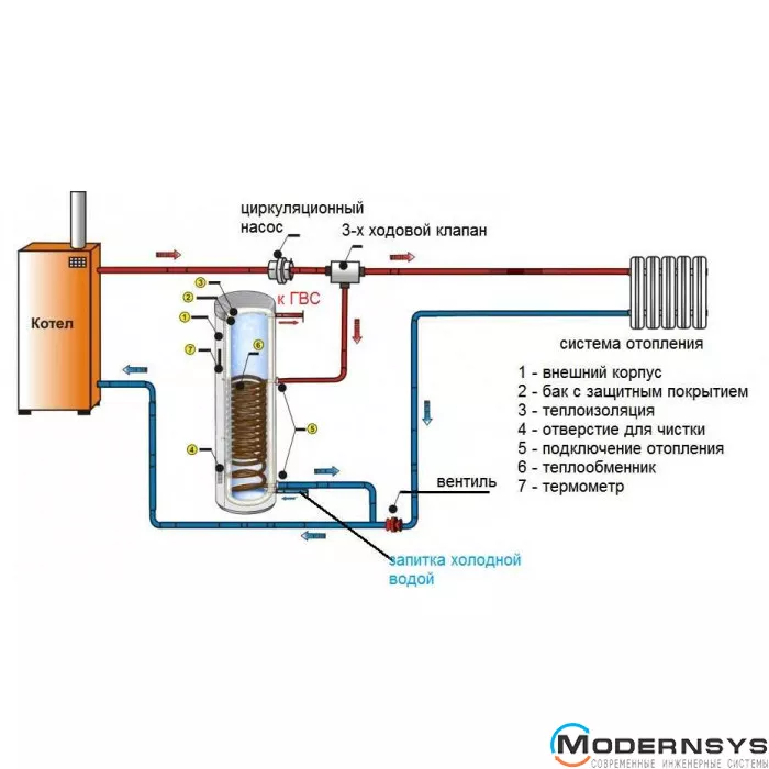 Бойлер має один низько розташований теплообмінник (змійовик) з великою площею поверхні теплообміну. Управління здійснюється за допомогою механічного терморегулятора.