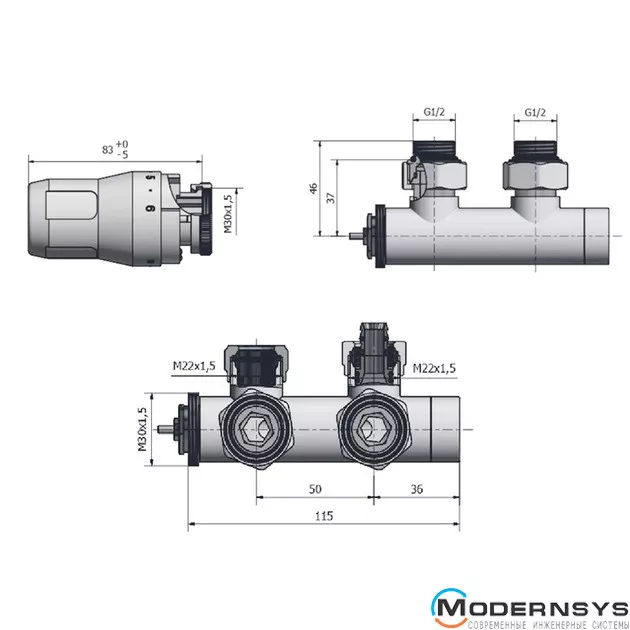 - Вузол підключення 3/4" x M22x1,5 мм, термостатична головка серії Brillant SH, перехідник (адаптер) для трубок 15 мм.