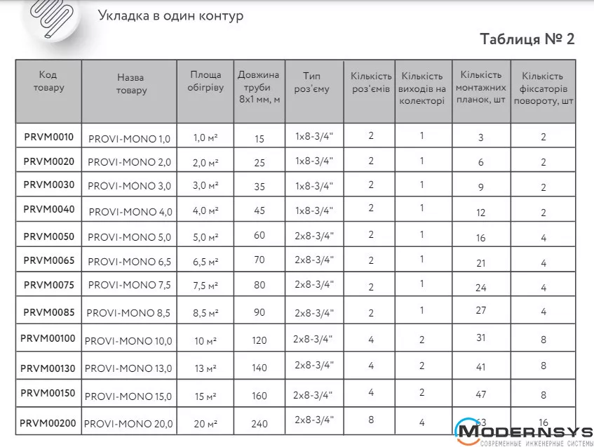 Технічні характеристики: Комплекты тонкого водяного теплого пола Provisim (Провисим) PROVI-MONO 7,5 м2 ( тип разъема 2х8-3/4", выход на коллекторе - 1)