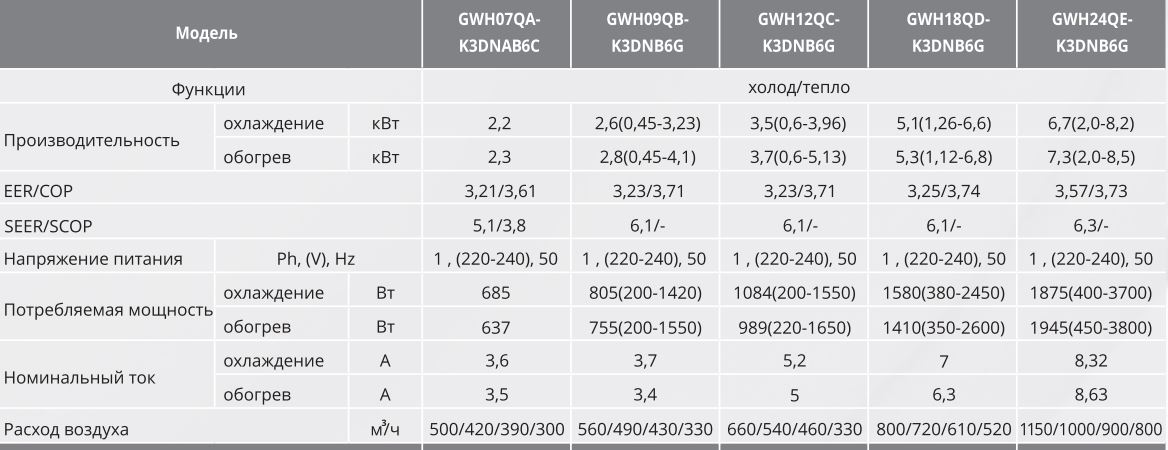 Технічні характеристики для серії кондиціонерів Gree GWH07Q-K3DNB6