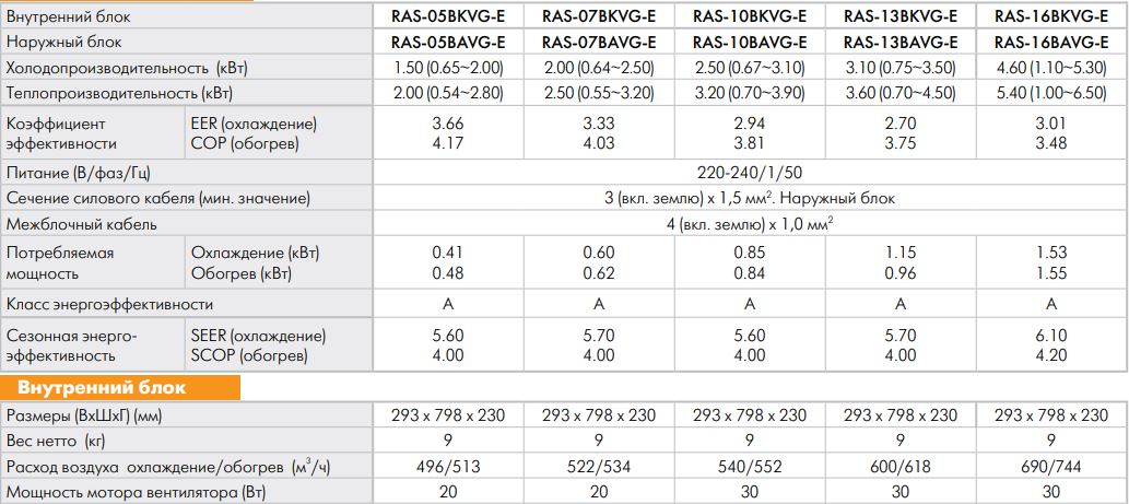 Технічні характеристики для серії кондиціонерів Toshiba RAS-BKVG-EE/RAS-BAVG-EE