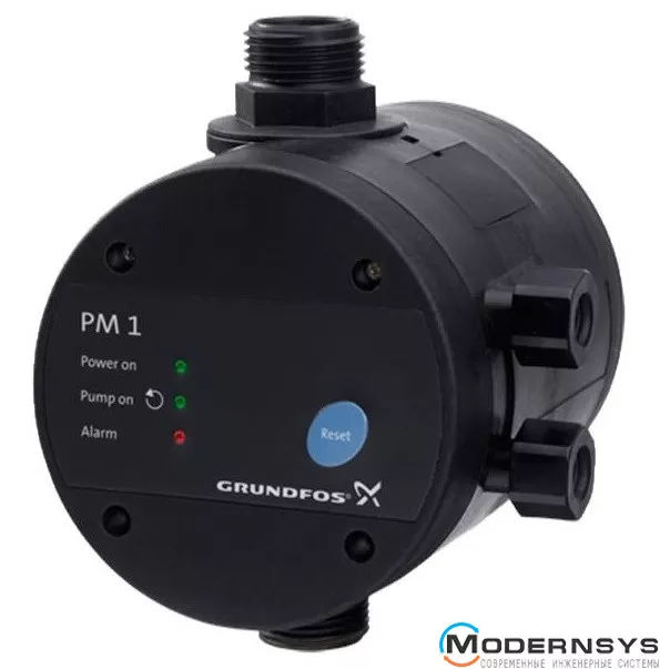 Реле тиску Grundfos PM 1 15 використовується для керування насосами для споживання води. За наявності споживання води та зниження тиску до 1,5 Бар (15 метрів водного стовпа) реле дає сигнал на включення насоса, при припиненні розбирання води реле відключає насос. Реле тиску Grundfos PM 1 15 також виконує функцію захисту від «сухого ходу», що дозволяє вимкнути насос під час зникнення води. PM 1 має компактні розміри і може бути змонтовано прямо на насосі, для зручності монтажу прокручується випускний патрубок. Реле укомплектовано мережним кабелем з вилкою та розеткою, що максимально спрощує підключення. На пристрої передбачена індикація живлення, роботи та аварії, а також кнопка перезапуску.