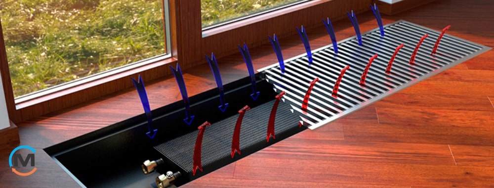 Сучасний водяний конвектор у підлозі може використовуватися як єдине джерело теплової енергії або доповнювати систему опалення в цілому. При цьому приміщення опалюється більш активно і рівномірно, ніж при використанні, наприклад, класичних, звичайних радіаторів. Холодне повітря, важче, опускається донизу, розігріте рухається вгору. Таким чином здійснюється безперервний рух повітря усередині приміщення.