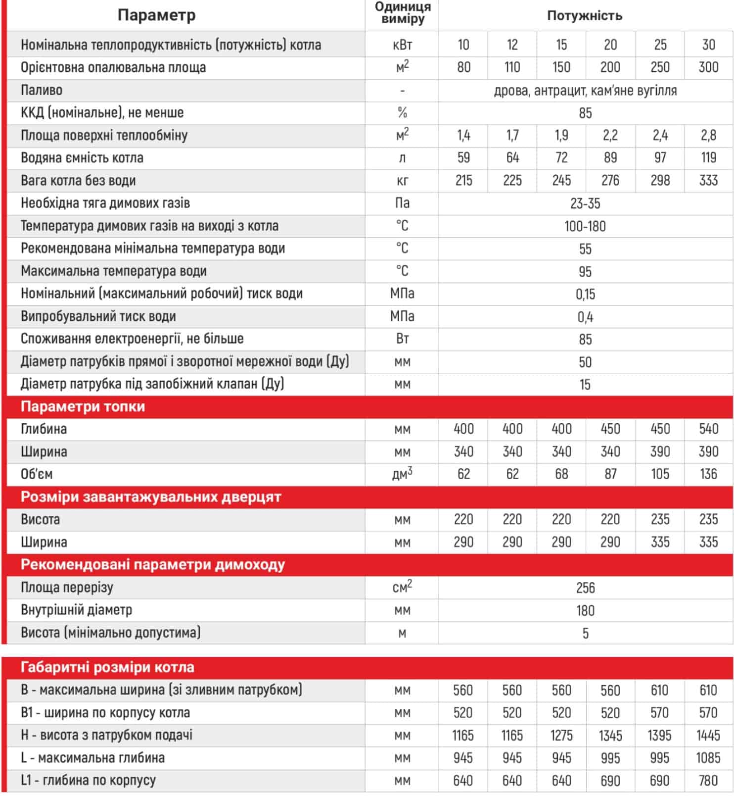 *** – котли потужністю 10 та 12 кВт мають 2 полиці теплообмінника.