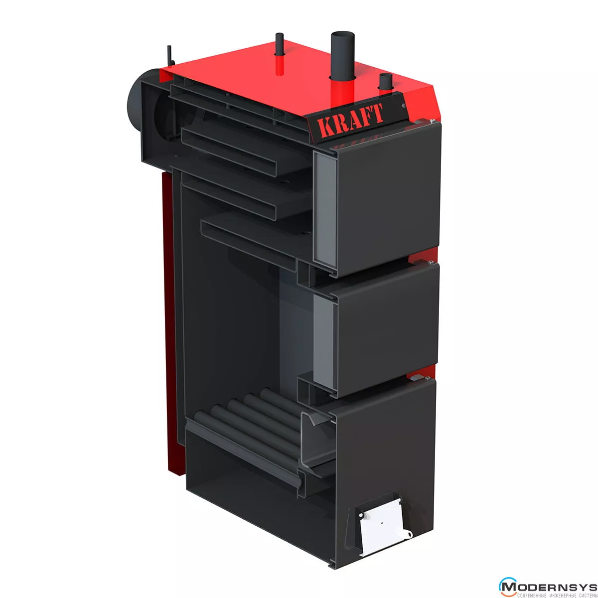 Конструкція котла має на увазі його експлуатацію як у режимі верхнього горіння, так і з нижнім горінням. Верхнє горіння забезпечується за рахунок подачі повітря у верхню частину топки через спеціальні форсунки, розташовані в стінках топки. Камера горіння має досить великі розміри, а Триходовий теплообмінник розрахований таким чином, щоб забезпечувати високу ефективність котла (ККД) при роботі на будь-якому виді палива. Теплобмінник, що застосовується в котлах Крафт, поличкового типу і розташований у верхній частині котла.