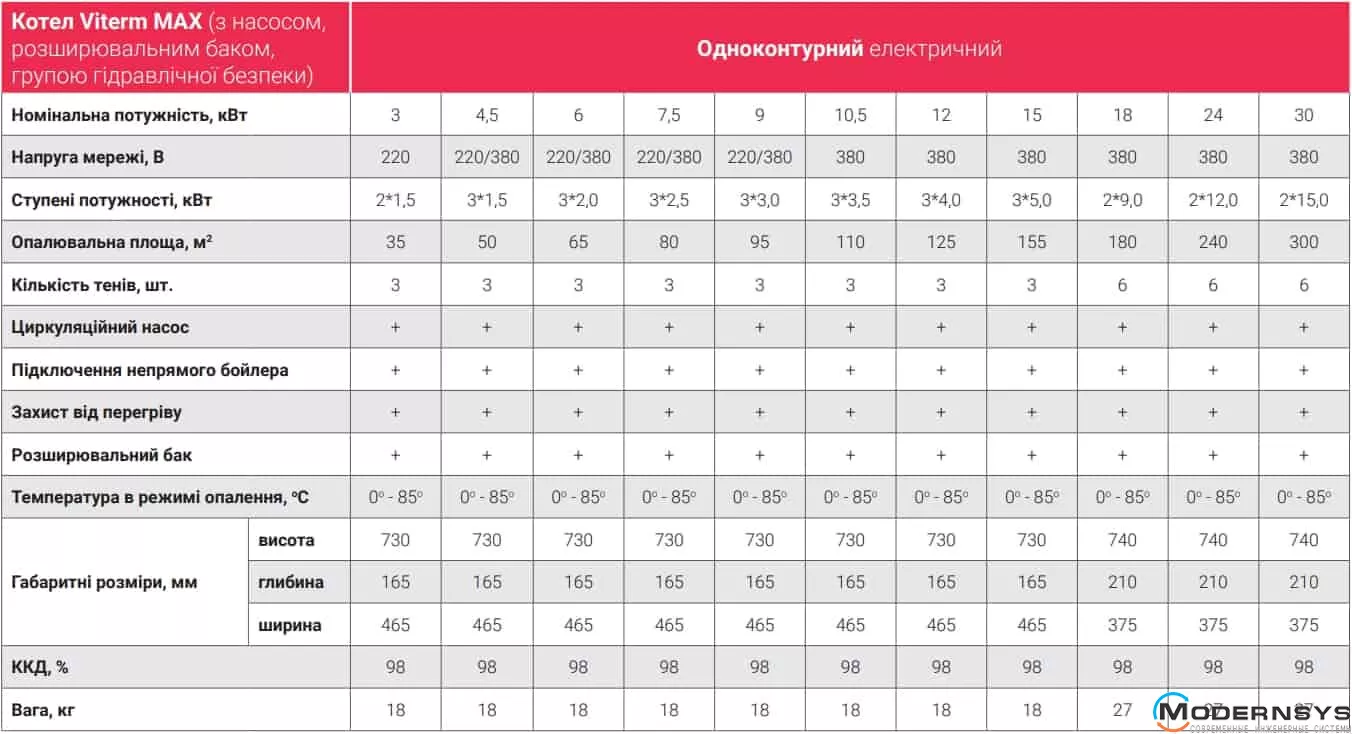 Технічні характеристики: Котел електричний VITERM MAX із насосом 12 кВт