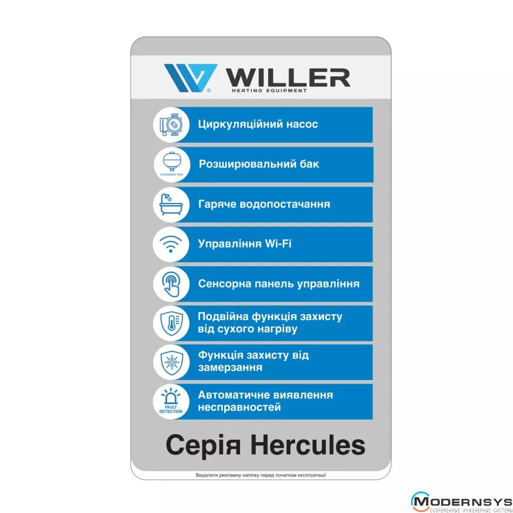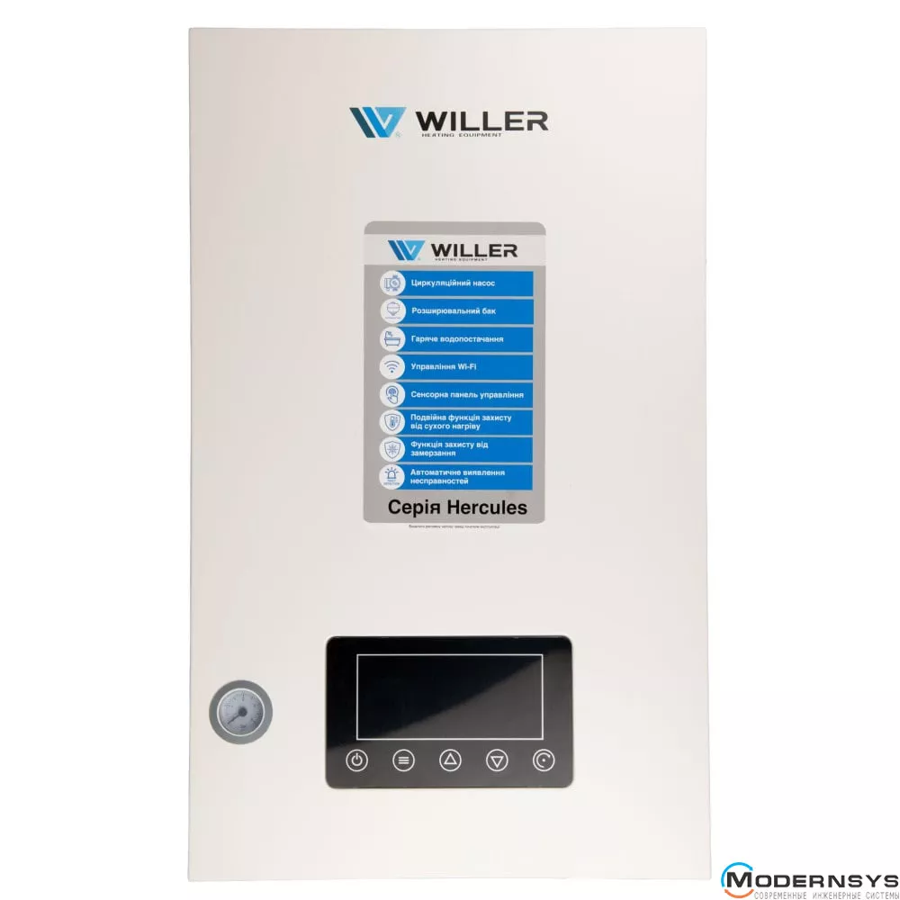 Електрокотел WILLER серії HERCULES призначений для опалення приміщень побутового призначення. Запатентована унікальна технологія нагрівального елемента. За допомогою клавіш, розташованих на панелі керування, можна провести регулювання температури опалення та гарячого водопостачання. РК-дисплей на панелі керування дозволяє легко ідентифікувати поточну температуру гарячого водопостачання та системи опалення. Крім актуальної температури на РК-дисплеї відображаються налаштування користувача.