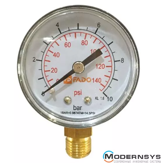 Опис: Манометр FADO (Фадо) вертикальний Д50 1/4" 10 бар