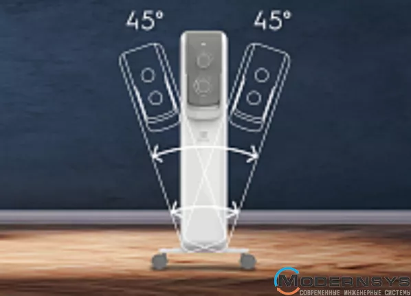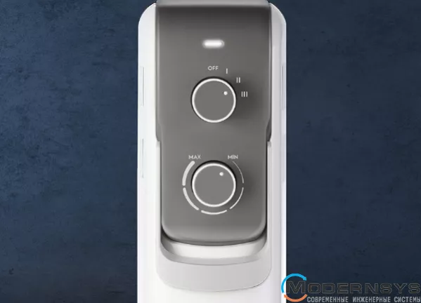 Регулювання температури нагрівання здійснюється круглою ручкою механічного термостату, розташованої на панелі керування. Перемикання режимів потужності виконується обертанням верхньої ручки, доступні режими (600/900/1500 Вт). Система захисту включає додатковий аварійний термостат, і датчик спрацювання вимкнення коли кут нахилу радіатора перевищує 45 градусів.