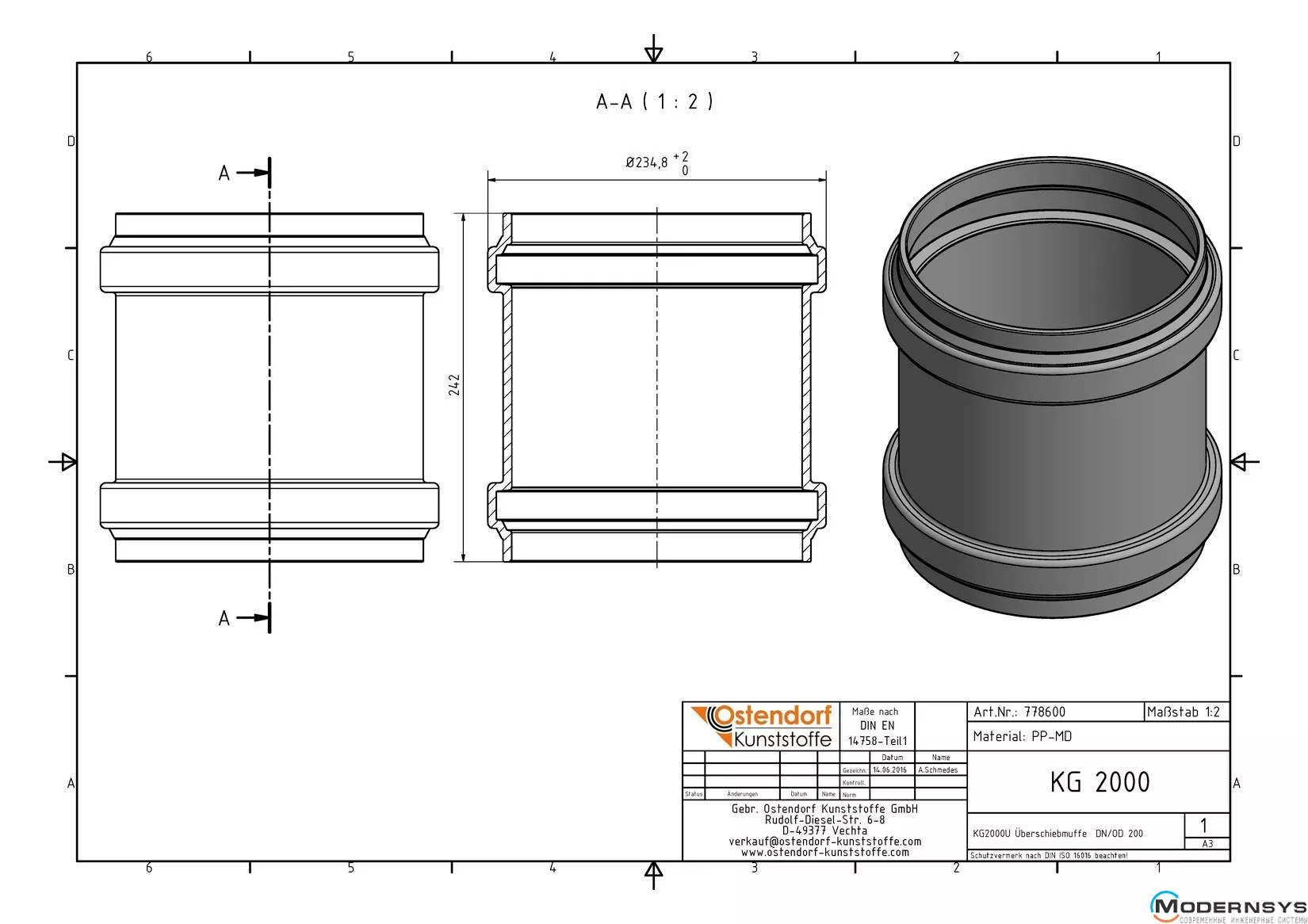 Технічні характеристики: Муфта каналізаційна ремонтна Ostendorf (Остендорф) KG2000U 200 мм