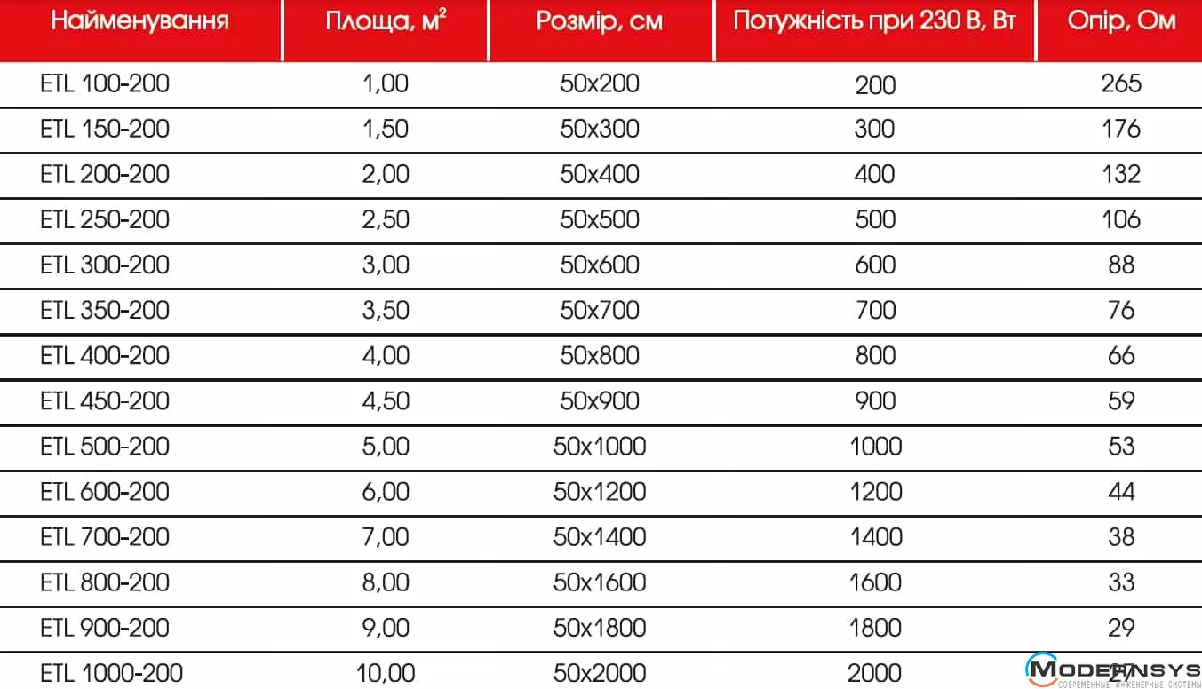 Технічні характеристики: Нагрівальний мат одножильний Extherm (Екстерм) ETL 200-200