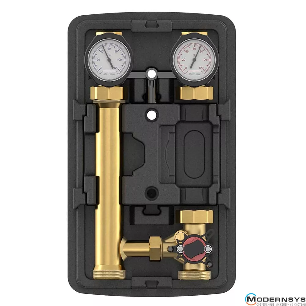 Повний комплект без циркуляційного помпи (монтажна довжина 180 мм); два кульових крана (зі зворотним клапаном у зворотній лінії); два контактні термометри, вбудовані в ручку кульового крана (діапазон 0 – 120 °C); 3-ходовий змішувач з байпасом, що налаштовується; ізоляція EPP; нижні з'єднання 1 ½" M плоске ущільнення, верхні з'єднання з внутрішнім різьбленням згідно розмірів насоса; настінний кронштейн.