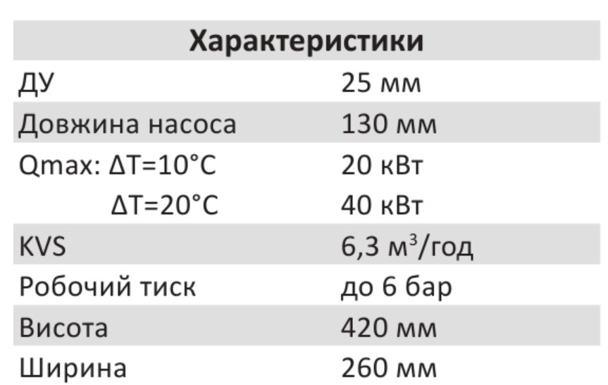 Підходить для котлів потужністю - при ΔT = 10 °C: 20 кВт, при ΔT = 20 °C: 40 кВт. Здатна витримувати температуру теплоносія - до 110 °С і тиск - до 6 бар. Підключається до колектора за допомогою внутрішнього різьблення 1", до споживача за допомогою зовнішнього різьблення 1". Міжосьова відстань патрубків підключення – 125 мм.