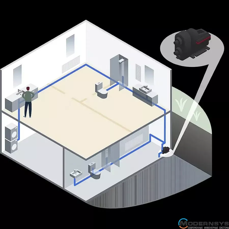 Вбудований датчик потоку вимірює тиск на вході, а інтелектуальне керування насосом регулює швидкість насоса відповідно до настройок власника будинку, забезпечуючи постійний тиск води у всьому будинку.