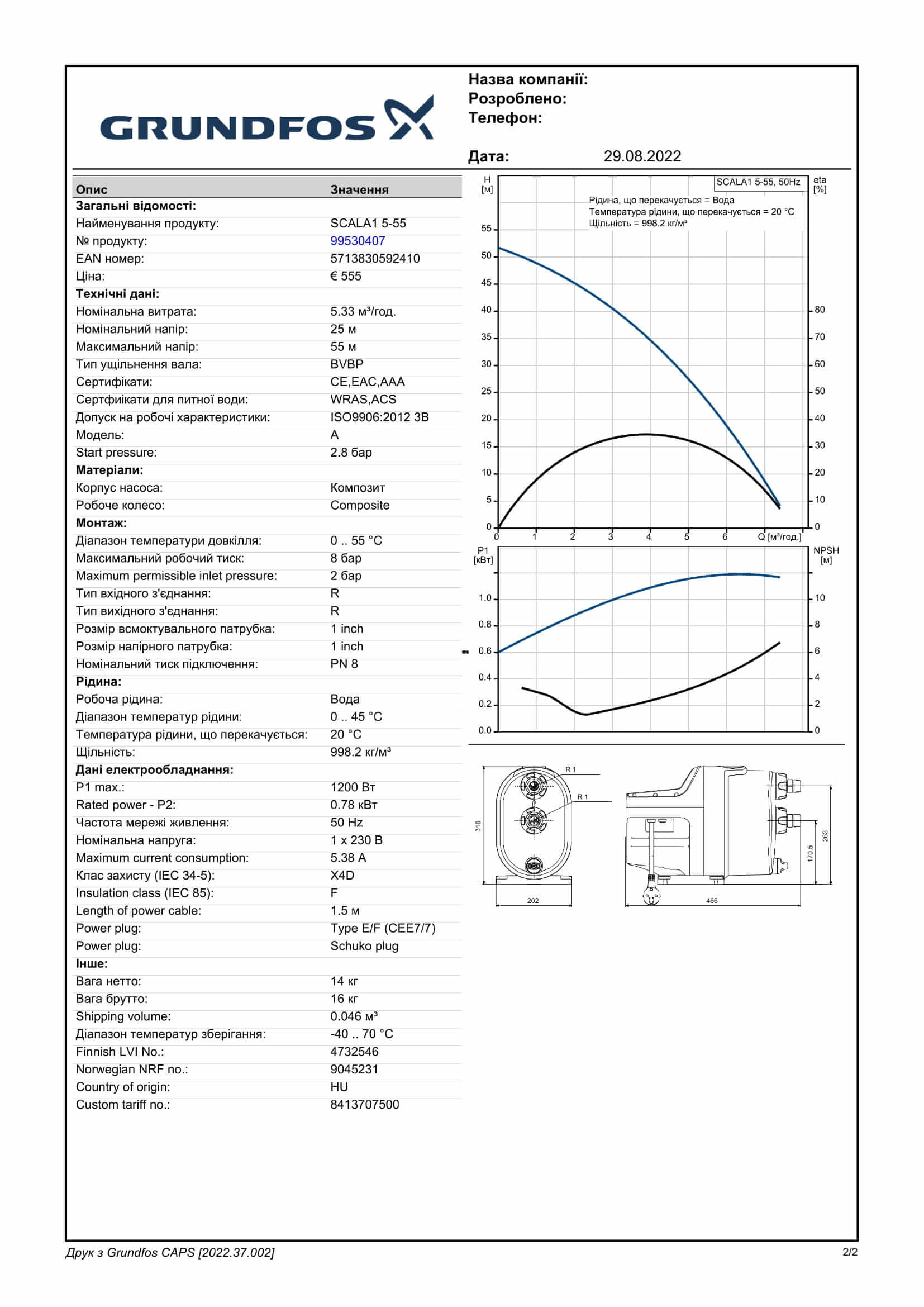 Технічні характеристики: Насосна установка Grundfos (Грундфос) SCALA1 5-55 1x230V 50H