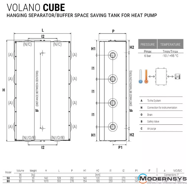 Буферні ємності для гарячої чи холодної води виконують функцію як гідравлічного роздільника , і буферного бака . Гідравлічний роздільник робить незалежними потоки теплового насоса та споживачів. Буферна функція знижує кількість включень/вимкнень теплового насоса. Підвісні буферні баки Volano Cube призначені для настінного монтажу. Ємності виготовлені із сталі, захищеної спеціальним антикорозійним покриттям. Cordivari Volano Cube підходять для зовнішньої установки. Високоефективна теплоізоляція виконана з екологічної жорсткої поліуретанової піни.