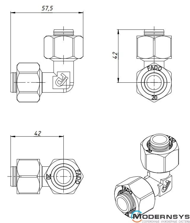 Кутник 90° затискний розбірний сполучний FADO - це якісний та надійний елемент трубопроводу, який забезпечує міцне та надійне з'єднання між трубами під кутом 90°. Він підходить для використання в різних галузях промисловості та будівництва, де потрібне точне та надійне з'єднання труб.