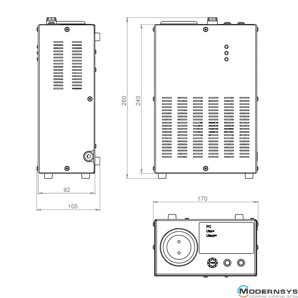 Стабілізатор виконаний у металевому корпусі прямокутної форми, що дозволяє експлуатувати його як у настінному, так і в настільному варіанті. Усі функціональні вузли стабілізатора розташовані на задній частині корпусу та закриті лицьовою панеллю. На верхній панелі стабілізатора знаходиться вимикач, запобіжник, вихідна розетка та індикатор роботи стабілізатора. Стабілізатор напруги вольтододаткового типу складається з автотрансформатора, комутаційних реле та контролера напруги.