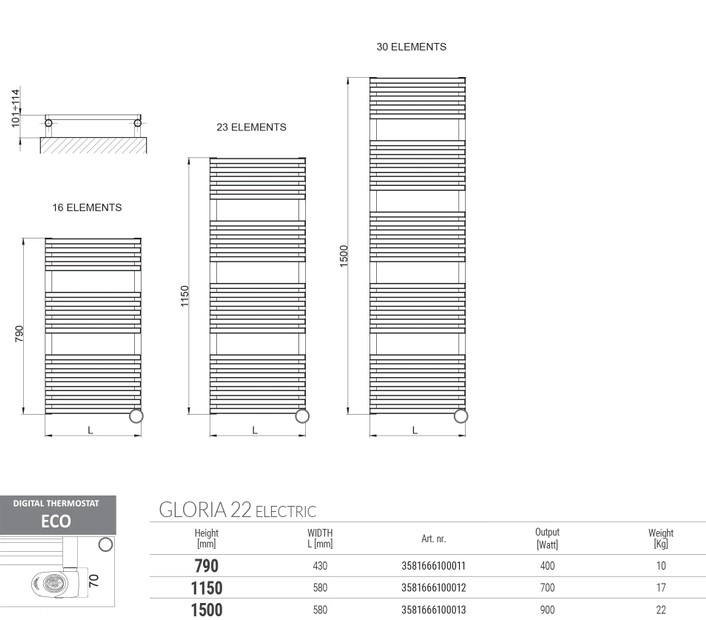 Технічні характеристики: Сушка для рушників електрична CORDIVARI (Кордивари) GLORIA 22 ELECTRIC 1500 x 580 мм COLOR F15 (чорний) ECO 90