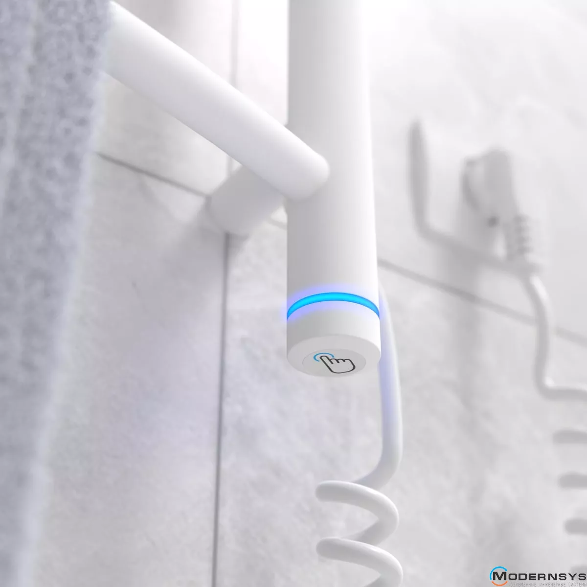 Сушка для рушників оснащена сенсорним регулятором температури з різнобарвним підсвічуванням. При включенні приладу в мережу загориться і згасне підсвічування синього кольору, це означає, що регулятор справний. Передбачено чотири режими роботи – 40, 60, 80 та 100% потужності, кожному відповідає своя світлова індикація. Щоб змінити режим, необхідно короткочасним торканням (менше 2 секунд) доторкнутися до сенсора, кожен наступний дотик буде призводити до зміни режиму: один за одним по колу.