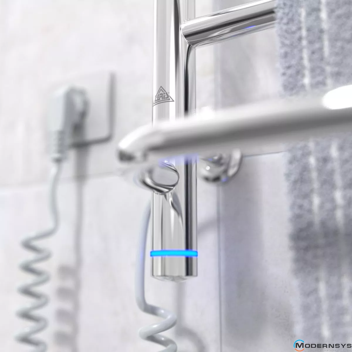 Весь рушникосібник виготовлений з високоякісної полірованої нержавіючої сталі AISI304. Блискуча поверхня виробу чудово гармонує з хромованою сантехнікою, візуально розширюючи простір, роблячи ванну кімнату більшою і світлішою. Прилад оснащений євровилкою і скрученим кабелем живлення, що запобігає провисанню. Звертаємо Вашу увагу, шнур живлення розташований з лівого або правого боку сушки для рушників.