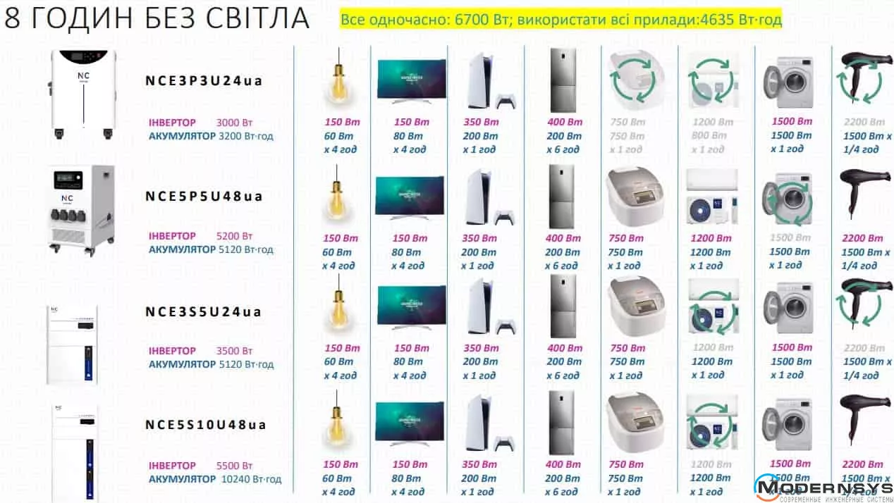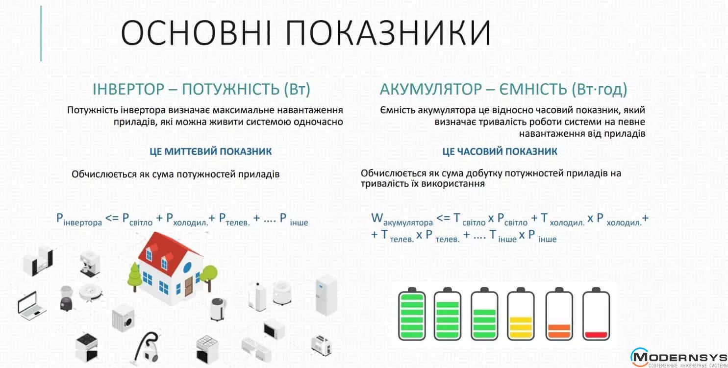 Інверторна система безперебійного енергоживлення має 2 основні параметри - потужність інвертора, що вимірюється у "Вт" і ємність батареї, що вимірюється у "Вт·ч". ). З іншого боку, ємність акумулятора відноситься до часу використання.