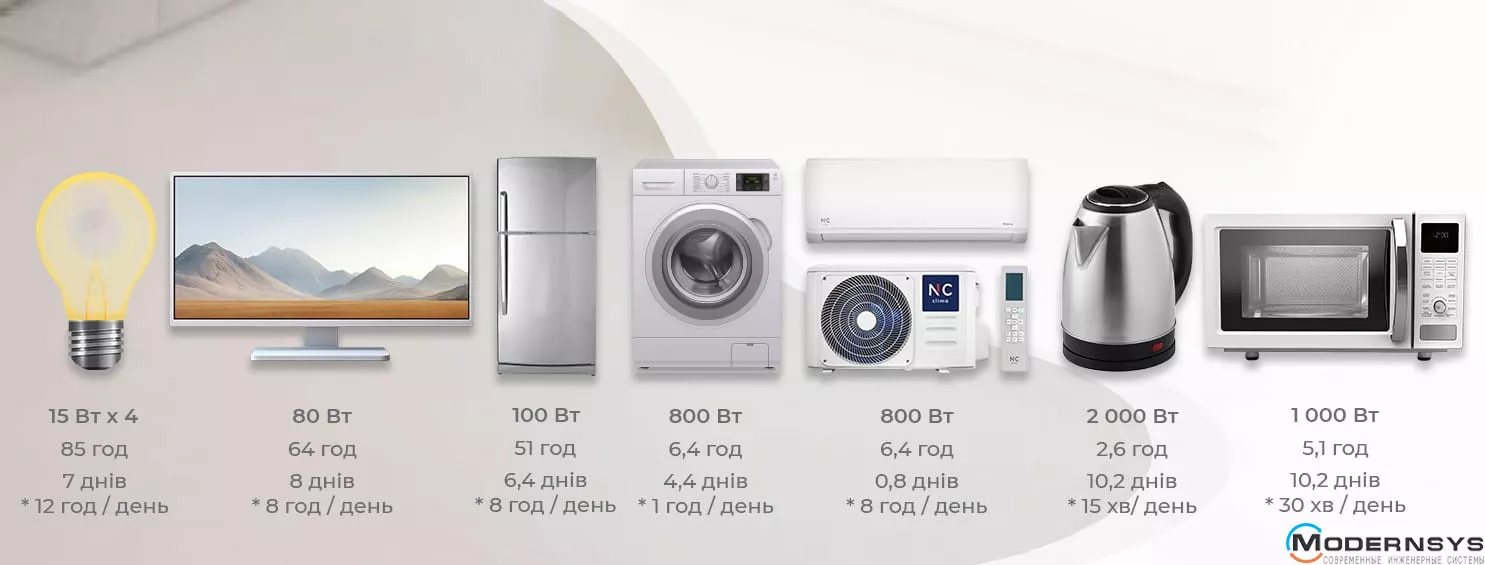 Тобто якщо холодильник у режимі спокою споживає 200 Вт, то через 5 годин він використовує 1000 Вт на годину енергії. Таким чином, батарея на 3000 Втч забезпечить роботою 15 годин. Фен на 2000 Вт: споживана енергія становитиме всього 2000 Вт · 0,25 год = 500 Вт.