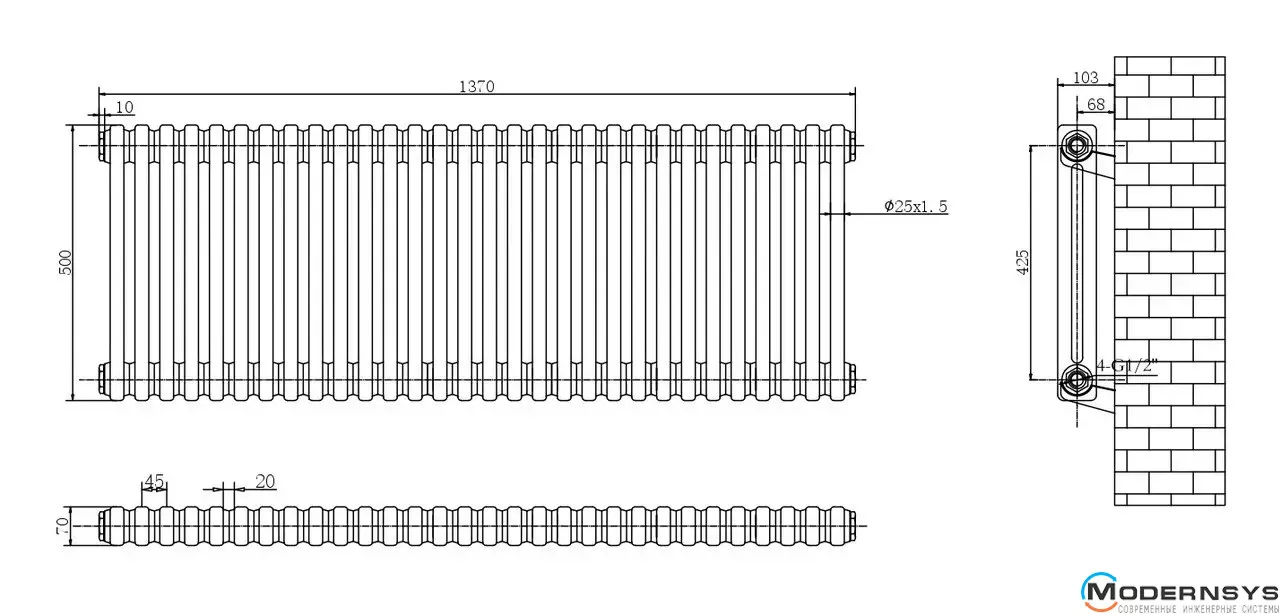 Технічні характеристики: Радіатор ARTTIDESIGN (Арттидизайн) Bari II G 30/500/1370 чорний матовий горизонтальний дизайнерський