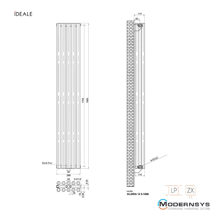 Технічні характеристики: Радіатор дизайнерський Ideale Gloria 12 5/1800/295 чорний