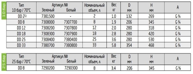 Назва товару КОД Обсяг (л) Макс. Тиск (бар) Колір Ціна Розширювальний бак ГВП Reflex DD 12 (білий) 10 бар 0000645872 899 грн Розширювальний бак ГВП Reflex DD 12 (зелений) 10 бар 0000645882 899 грн Розширювальний бак ГВП Reflex DD 25 (білий) 10 бар 0000645923 969 грн Розширювальний бак ГВП Reflex DD 25 (зелений) 10 бар 0000645933 969 грн Розширювальний бак ГВП Reflex DD 8 (білий) 10 бар 0000645962 546 грн Розширювальний бак ГВП Reflex DD 33 (білий) 10 бар 0000645945 205 грн Розширювальний бак ГВП Reflex DD 33 (зелений) 10 бар 0000645955 205 грн Розширювальний бак ГВП Reflex DD 18 (білий) 10 бар 0000645893 327 грн Розширювальний бак ГВП Reflex DD 18 (зелений) 10 бар 0000645903 327 грн Розширювальний бак ГВП Reflex DD 8 (зелений) 25 бар 0000645993 723 грн