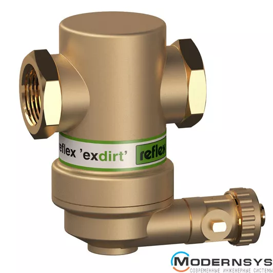 Видалення бруду та шламу в Reflex ’exdirt’ за принципом роботи нагадує видалення повітряних мікробульбашок: потік теплоносія проходить через область з великим поперечним перерізом і низькою швидкістю потоку. Проходячи через унікальну сітку, сплетену з дроту, частинки шламу та бруду сповільнюються та осідають у спеціальній камері. Цю камеру можна легко очищати за допомогою спускного крана, дозволяючи не відключати при цьому систему.