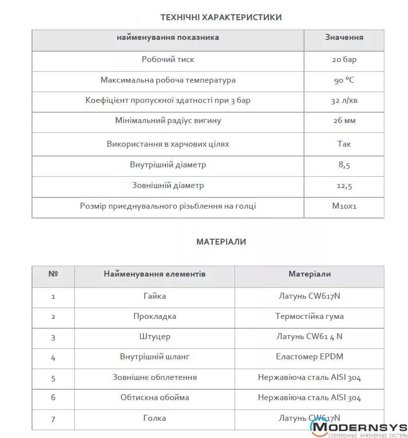 Підводка складається з термостійкого гумового шланга у зовнішній обплетенні з нержавіючої сталі AISI 304. Гайки з нікельованої латуні.