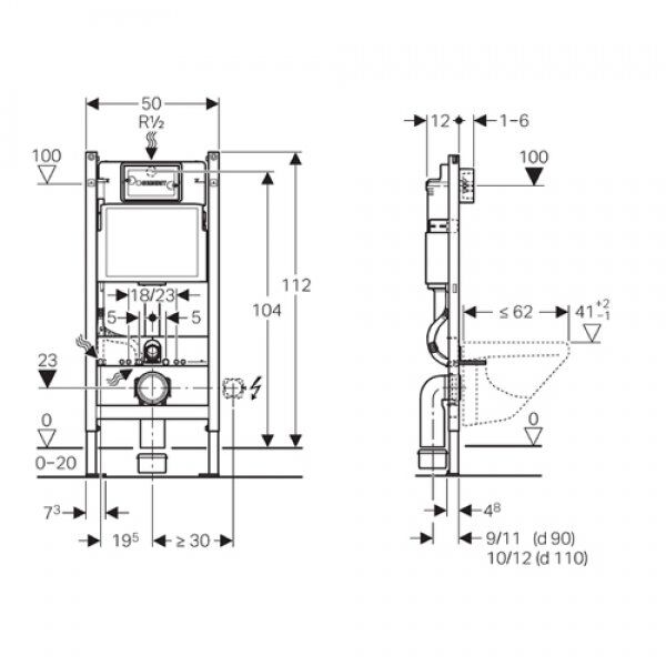 - Для підвісних унітазів з розмірами підключення згідно з EN 33:2011