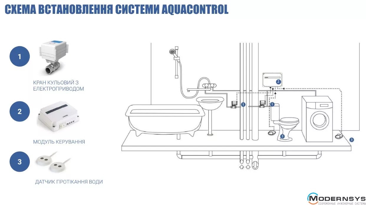 При попаданні води на будь-який з датчиків, підключених до модуля управління, напруга, що управляє, подається на крани кульові з електроприводом, підключені до цього ж модуля, які заблокують подачу води.